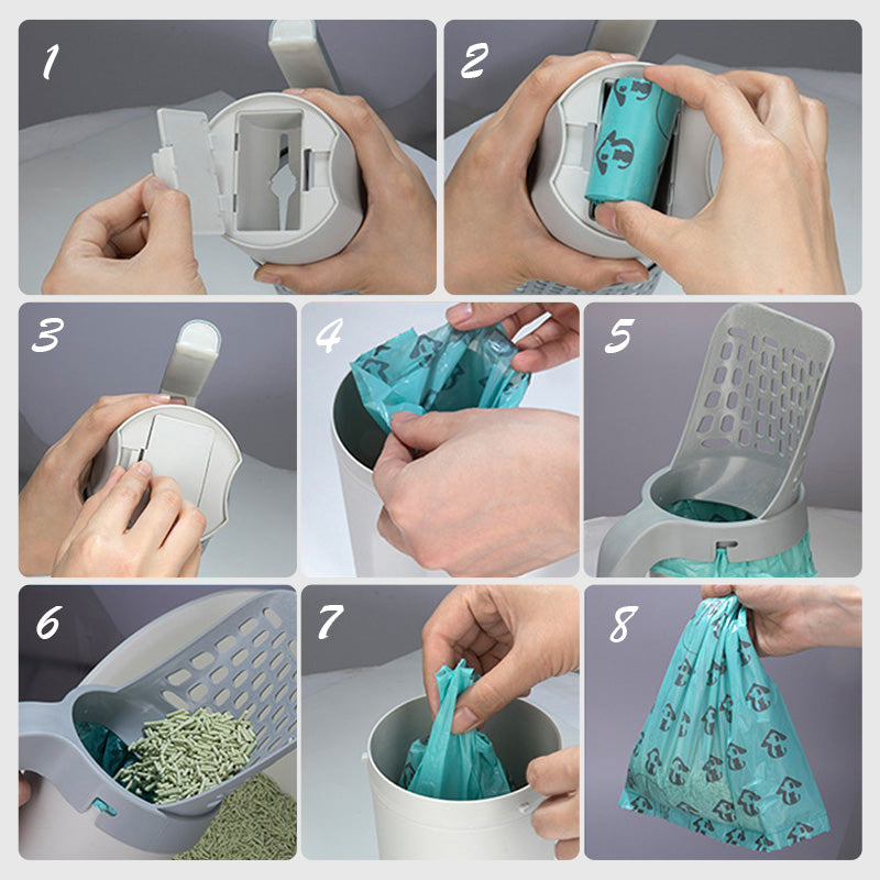 Det praktiske 2-i-1-Kattesand-Skopsettet kombinerer en skuffe med en beholder og poser, noe som gjør det enkelt å tømme kattesandkassen, automatisk pakke inn avfallet og deretter fjerne posen, slik at hendene dine blir rene. Designet for bruk med én hånd, forbedrer det effektiviteten ved daglig rengjøring.