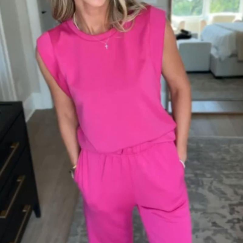 Avslappet todelt sett for kvinner: kortermet topp og bukser med vide ben