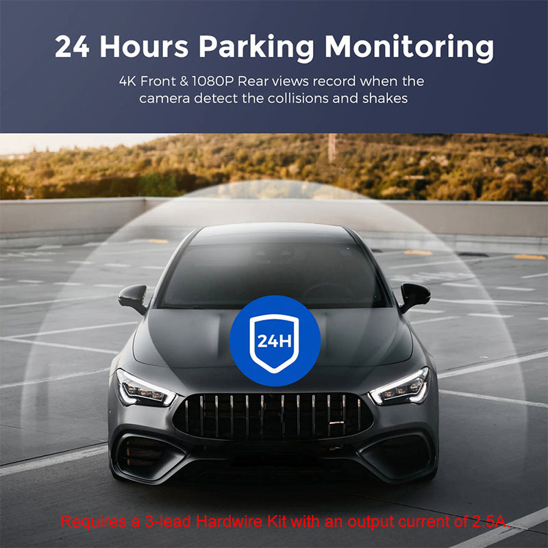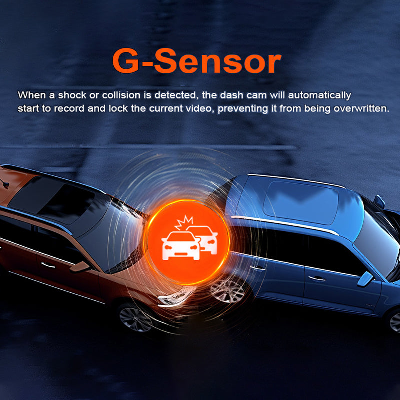 24-TIMERS PARKERINGSMONITORING MED G-SENSOR: Beskytt kjøretøyet selv når det er parkert. G-sensoren oppdager bevegelse og støt, starter automatisk opptak og låser video som bevis.