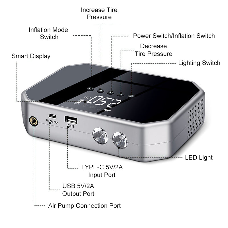 Alt-i-ett nødstartstrømforsyning og oppblåsbart pumpesett for bil