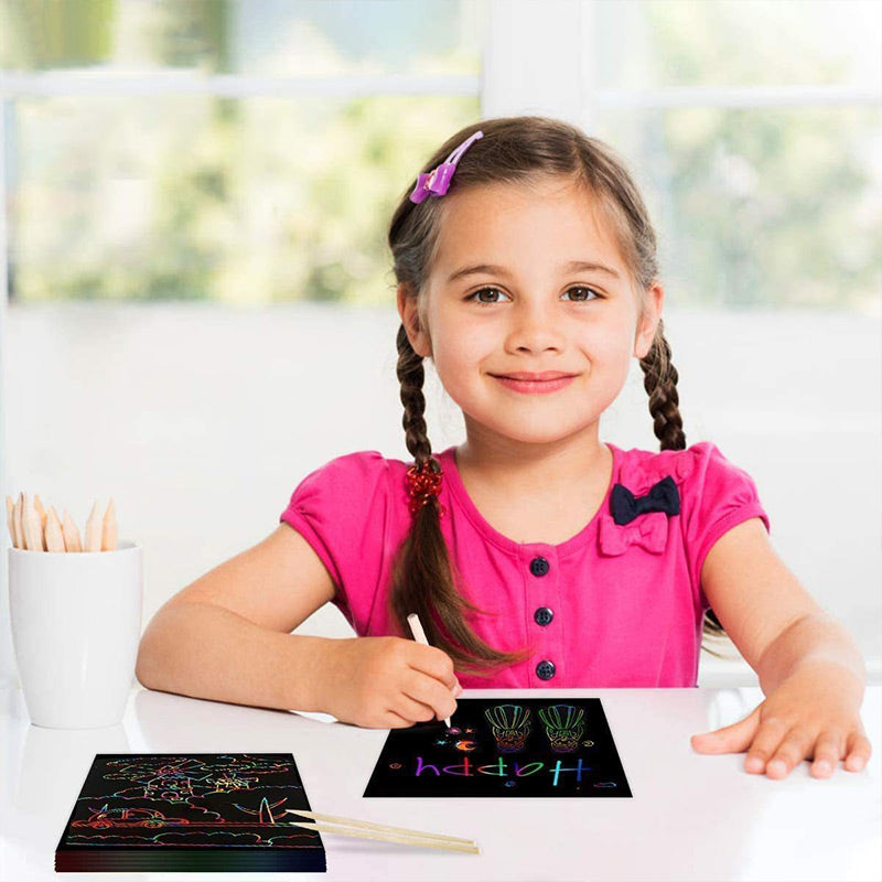 ENDELØS KREATIVITET: Dette kunstsettet gir en morsom og engasjerende måte å slippe løs kreativiteten din på. Skrap bort den svarte overflaten for å avdekke livlige regnbuefarger under, slik at du kan lage fantastiske og unike design med hver ripe.