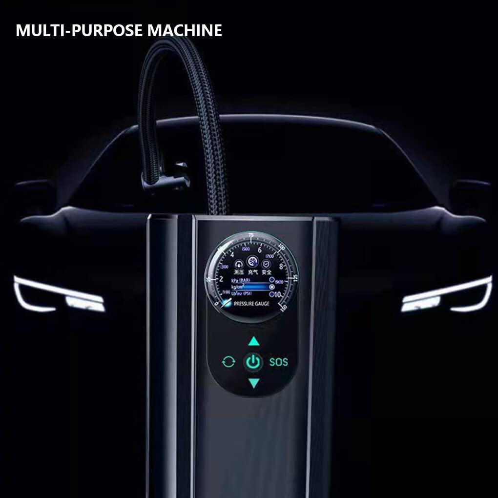 Praktisk og Enkel å Bruke: Den bærbare luftpumpen er designet for å være brukervennlig og behagelig å bruke. Den har et tydelig LCD-display, intuitive knappekontroller og LED-lys som viser ladestatus og trykknivå. Det ergonomiske håndtaket gjør den behagelig å holde og bruke.