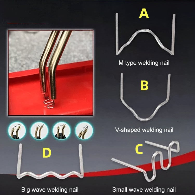 3-I-1 MULTIFUNKSJONELT PLASTSVEISESETT - 6 typer varmestifter er egnet for sveising i ulike situasjoner, det er 2 glattende hoder og 7 glatte stiftemerker. Kombinert med andre verktøy, kan det reparere hull og glatte overflater, uten behov for å kjøpe ekstra verktøy. Det 3-i-1 multifunksjonelle plast sveiseverktøyet kan gjøre sveisingen mer solid og perfekt.