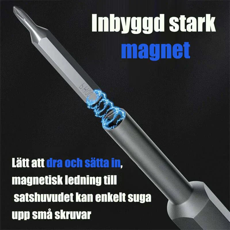 Magnetisk holder: Den magnetiske holderen letter enkel utskifting og bytting av bits, noe som øker skrutrekker-settets allsidighet.