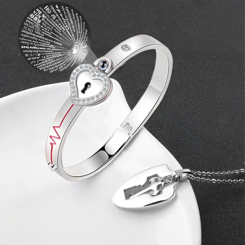 Overrask den spesielle personen i livet ditt med vårt Låsarmbånd og Nøkkelhalskjede Sett. Vårt armbånd og halskjede sett er den perfekte symbolet på kjærlighet og samhørighet. Dere vil begge bli påminnet om deres evige bånd, selv om dere er miles fra hverandre.