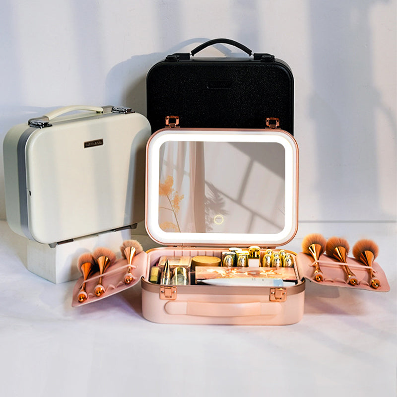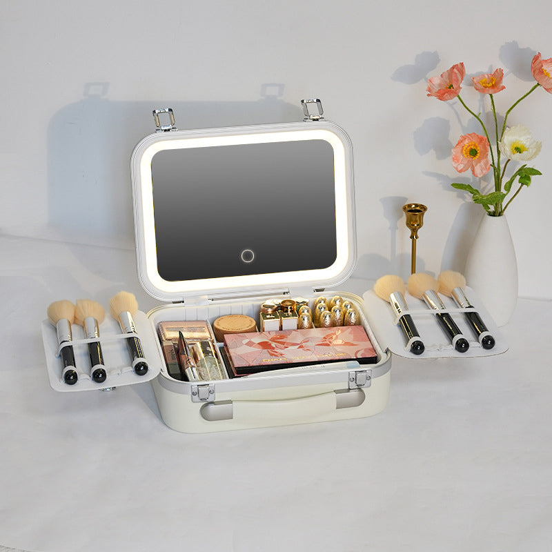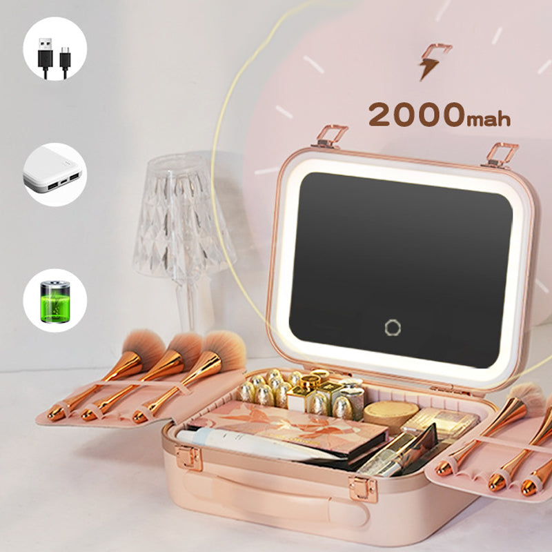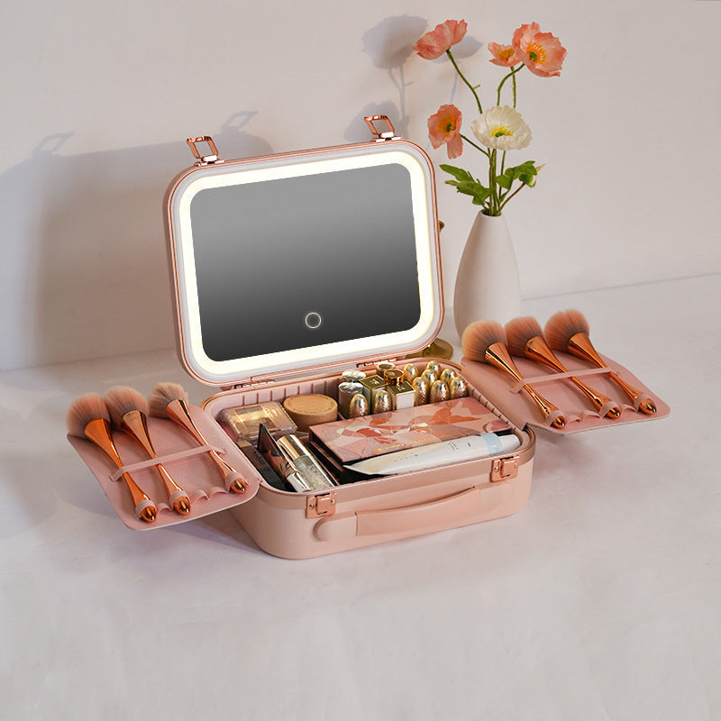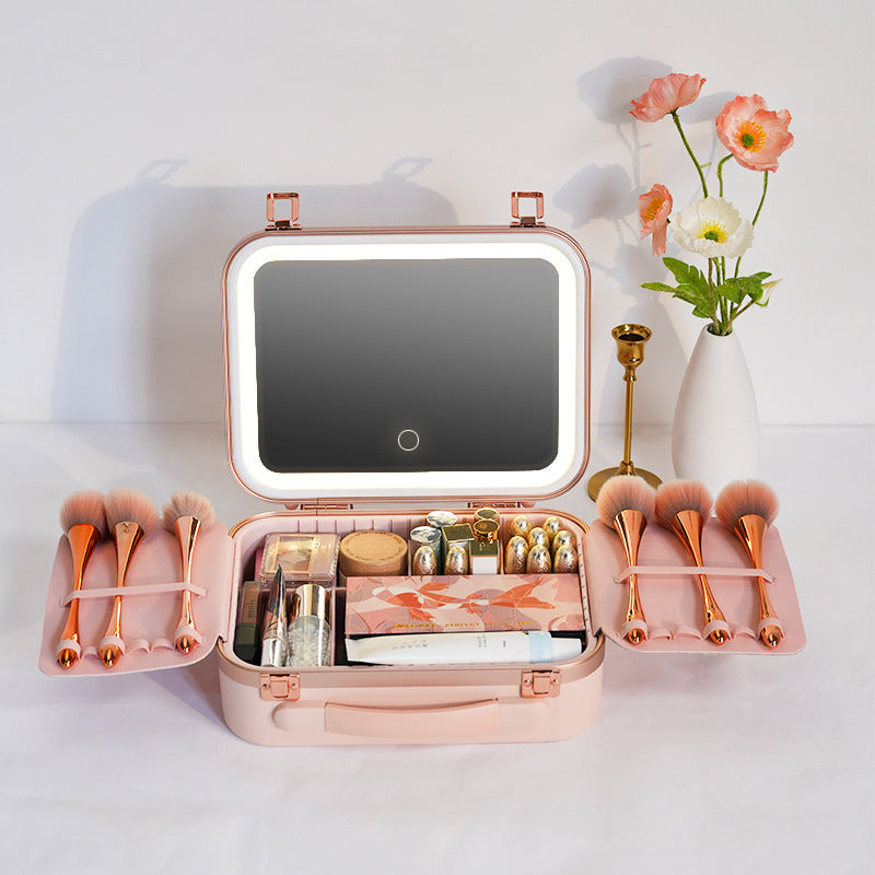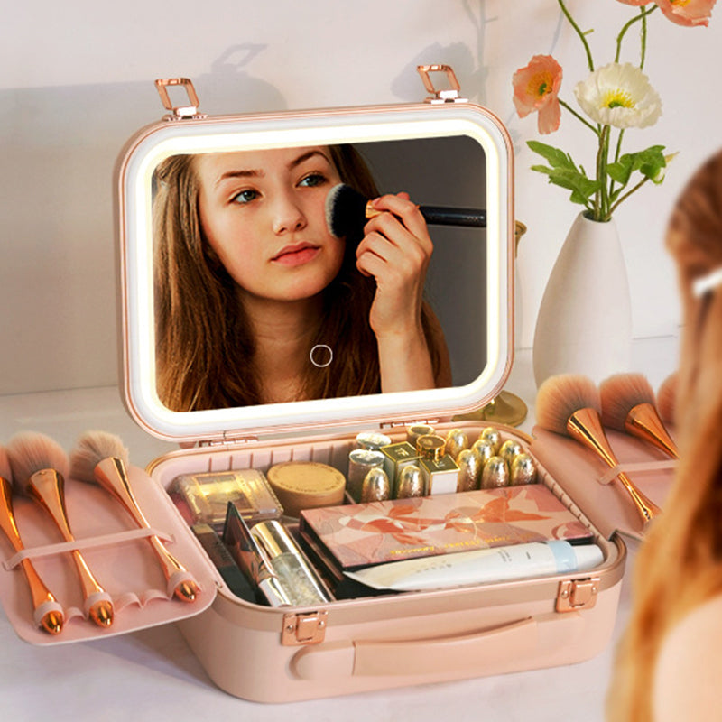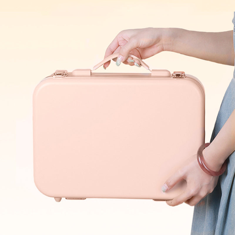 BÆRBARHET OG ROM: Designet for mobilitet, denne bærbare sminkevesken med LED-speil er kompakt og lett, ideell for reise. Den gir god plass med flere rom for å organisere kosmetikk, børster og tilbehør på en ryddig måte.