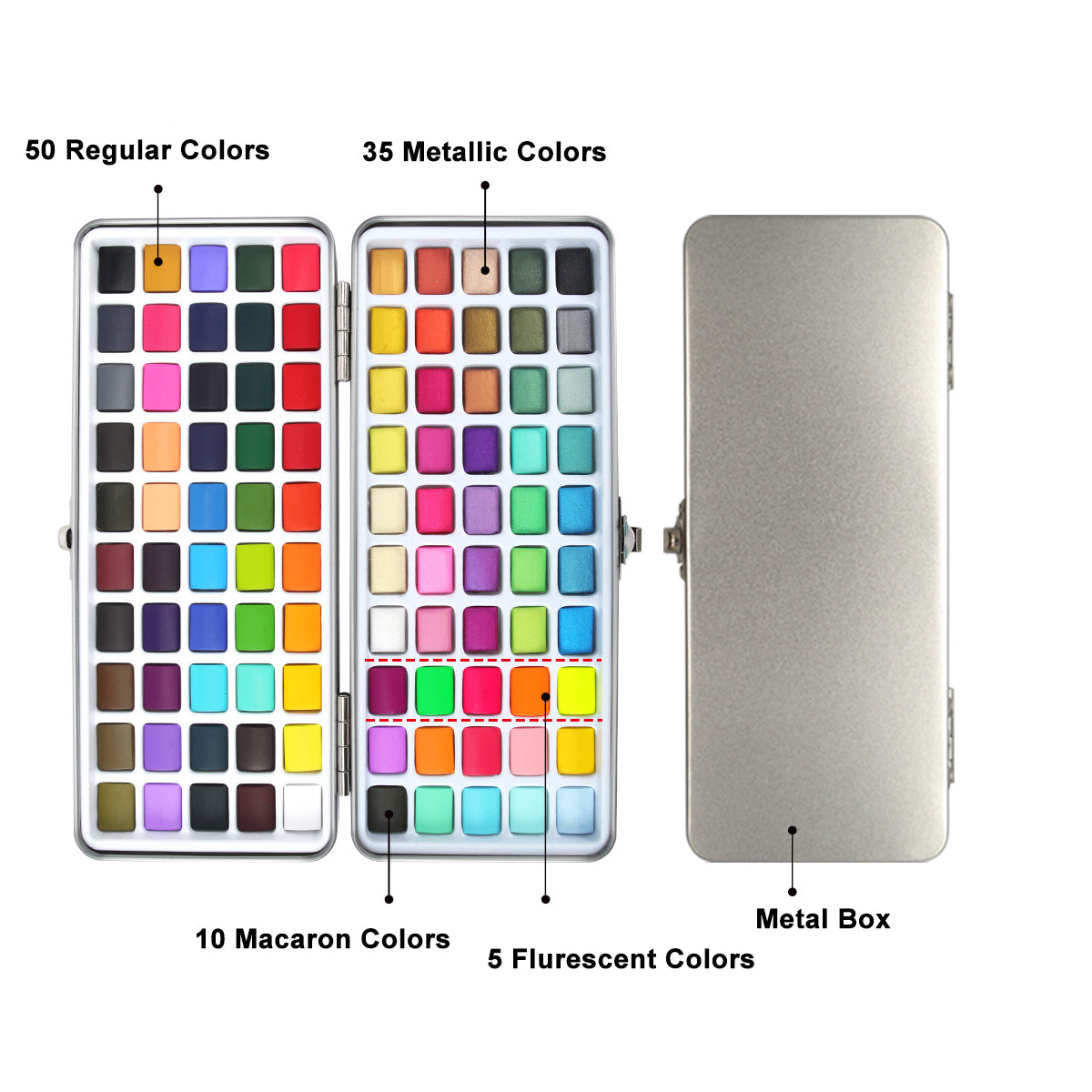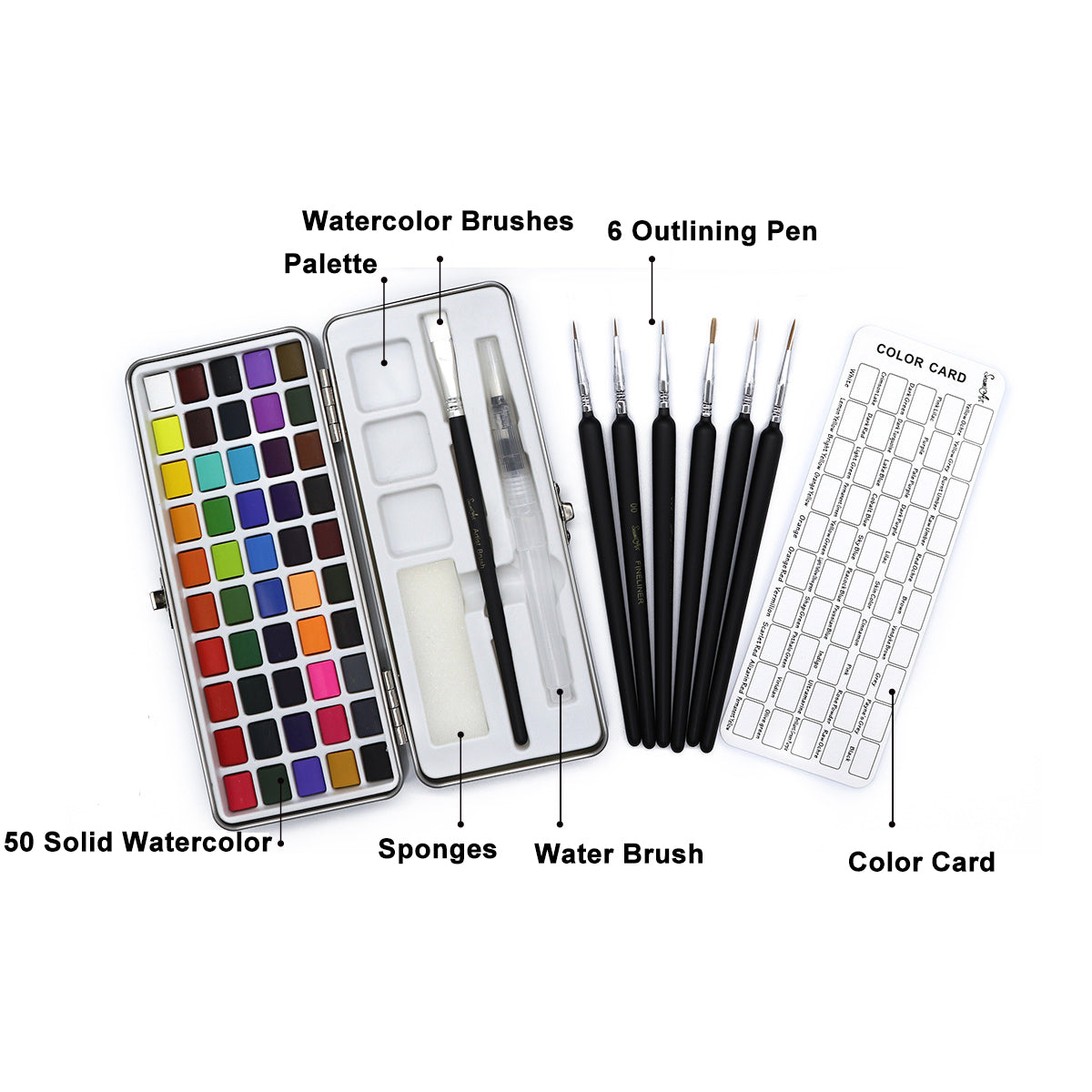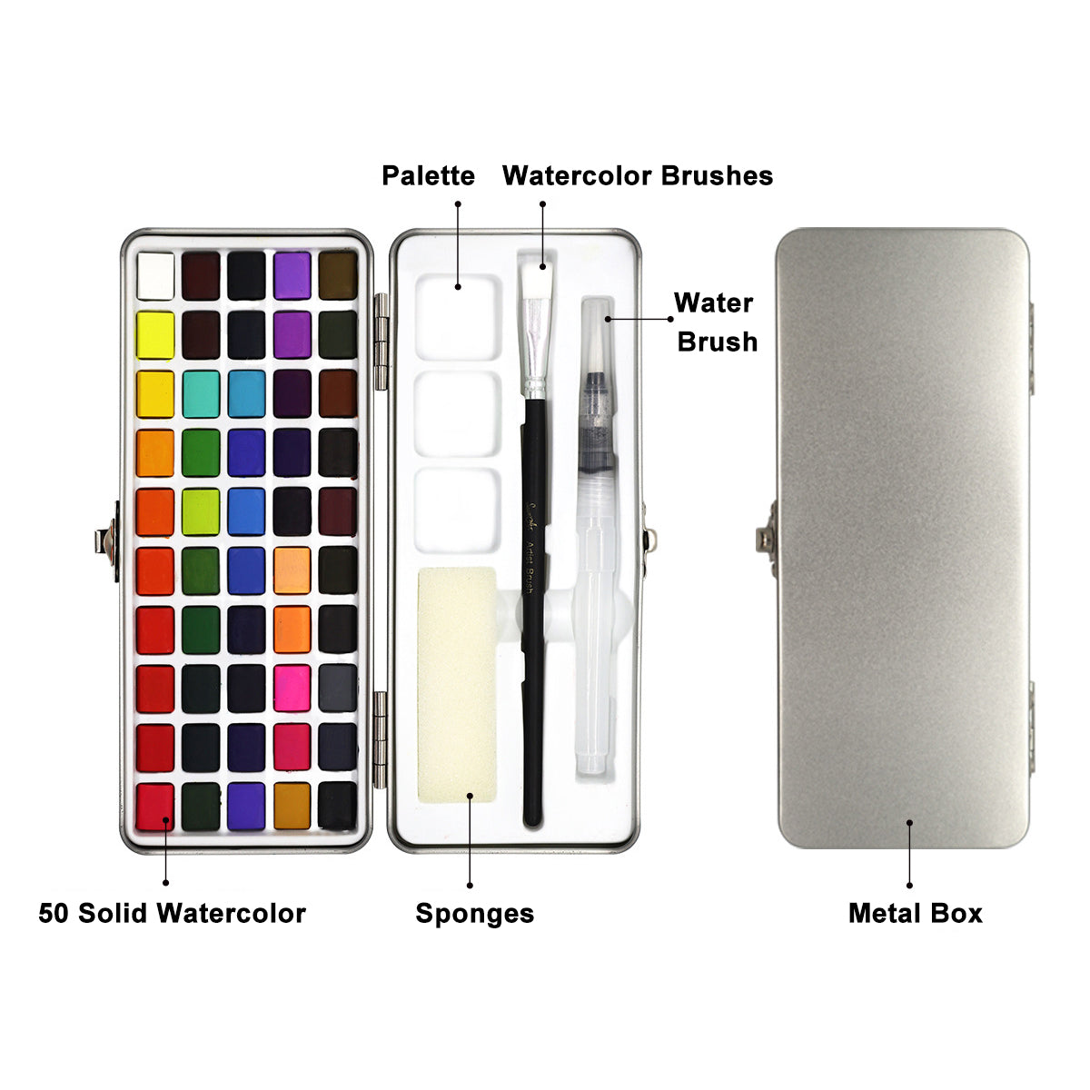 Akvarellfarge sett inneholder akvarellfarger av høy kvalitet som er lette å blande og har mange farge alternativer, slik at du slipper å blande egne farger. De 50 unike fargene er nøye utvalgt for å dekke de grunnleggende behovene i det daglige malearbeidet. Med de strålende fargene i denne paletten kan du oppnå en rekke ulike effekter, fra kraftige, levende bilder til sarte akvarell vasker!