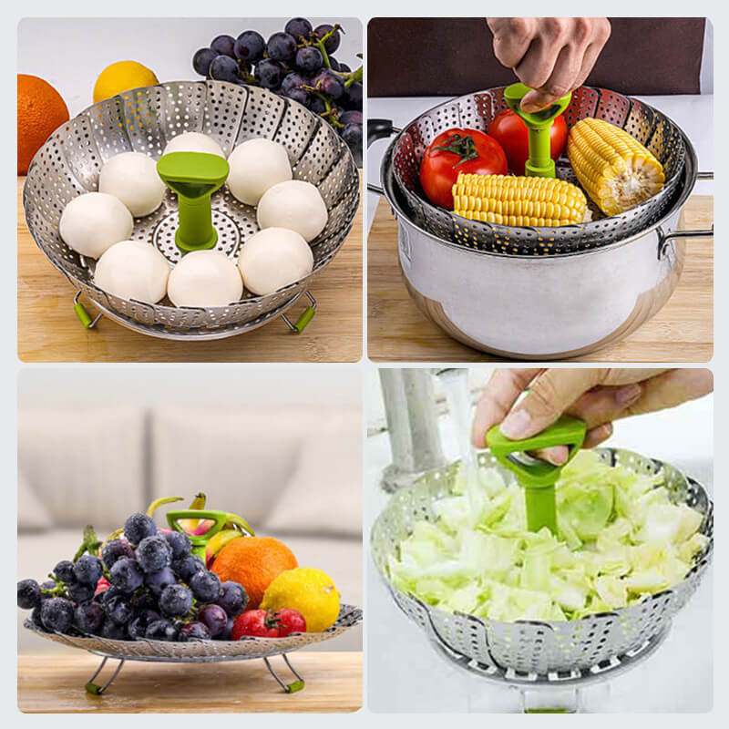 Vegetabilsk damperkurv er ikke bare perfekt for dampende grønnsaker som blomkål, gulrøtter, mais og poteter, men kan også brukes til å dampkrabbe, sjømat, kjøtt og til og med desserter. I tillegg kan den doble som en fruktkurv, sil, eggestativ eller fruktplate. Det er et viktig verktøy for ethvert kjøkken.