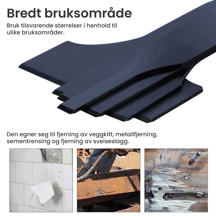 ANVENDELSESOMRÅDE: 10 mm, 30 mm og 50 mm skjær for presis meisling av harde materialer, 100 mm skjær for store områder og mykere materialer.