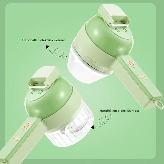 Leveres med 2 forskjellige sylskarpe kniver for kutting og hakking av mat. Den kan også brukes som elektrisk rengjøringsapparat ved å sette på den medfølgende børsten og bruke den. Ideell til å skrubbe gryter, stekepanner, kasseroller og annet kjøkkenutstyr. Sparer deg for mye tid og arbeid med kutting, hakking, skrelling og til og med rengjøring etterpå.