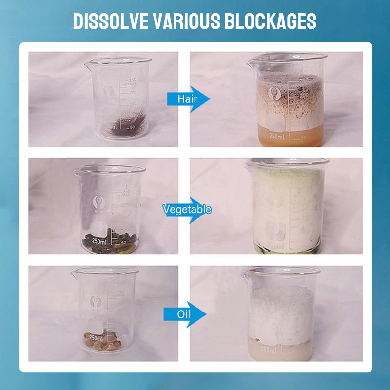 Kraftig Funksjon: Den kan raskt løse rørproblemer som hår, papir, såpeskum, grønnsaker, frukt, matrester, fett og organisk materiale.